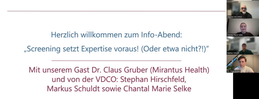 Im Rahmen eines digitalen Infoabends der VDCO unter dem Titel „Screening setzt Expertise voraus – oder nicht?“ diskutierten Vertreter:innen der VDCO, Stephan Hirschfeld, Markus Schuldt und Chantal Marie Selke mit Dr. Claus Gruber von Mirantus Health über Telemedizin als Standard und weitere mögliche Entwicklungen in der augenmedizinischen Versorgung.