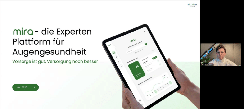 Mirantus Health setzt der Entwicklung ein telemedizinisches Versorgungsmodell entgegen. Das Unternehmen hat eine digitale Plattform entwickelt, die standardisierte Augenuntersuchungen vor Ort – etwa bei Augenoptikern als auch in mobilen Einheiten mit der Befundung durch Augenärzte vernetzt. Dabei werden vor Ort durch vorab geschultes Personal, Augenoptiker oder Optometristen grundlegende optometrische Parameter erhoben, darunter Visusbestimmung, subjektive Refraktion, intraokularer Druck sowie bildgebende Verfahren des hinteren Augenabschnitts und ggfls. des vorderen Augenabschnitts.